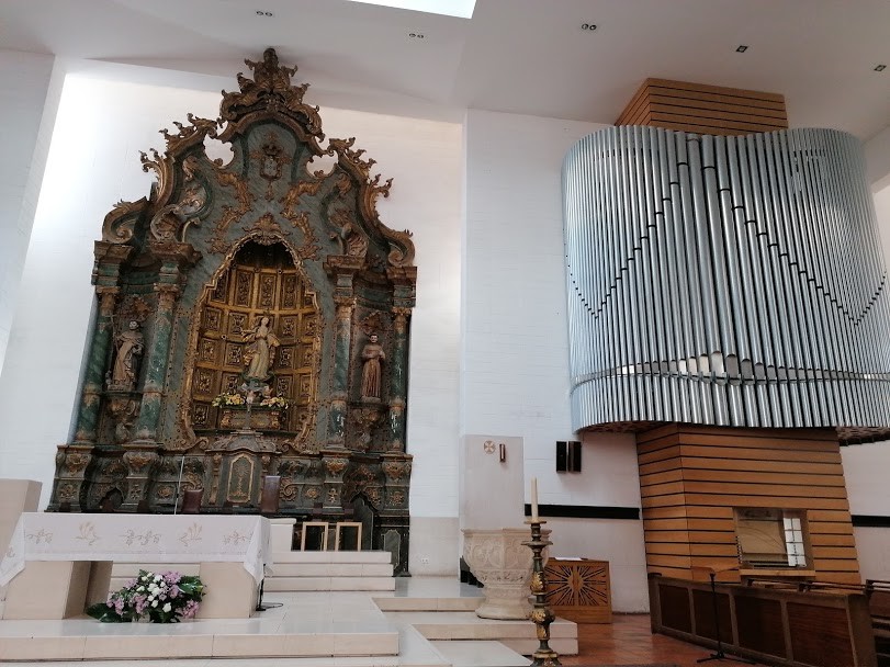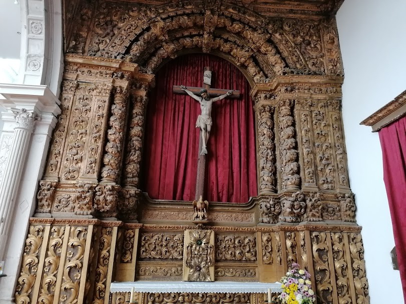 Os espaços exteriores são largos, bem arranjados e solenes, com aquele célebre cruzeiro e aquela colunata a reservar o ambiente. Dentro, para além do cruzeiro original (lá fora está uma réplica), encontramos uma igreja de uma só nave, com várias capelas laterais a alongar o espaço, muito estilo barroco com vários retábulos em talha dourada e, ao lado direito da capela-mor, um moderno órgão metalizado que destoa e fere o olhar, perdoem a expressão.