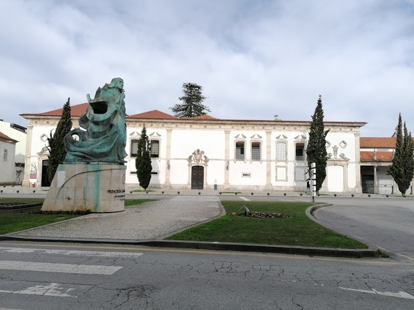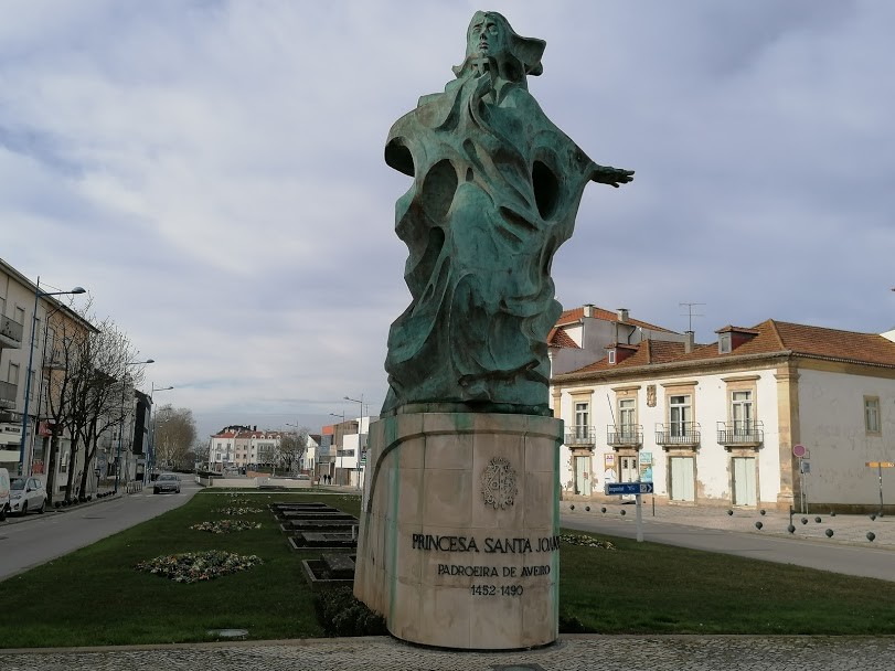 Nos largos espaços exteriores, no meio do trânsito, ainda pudemos admirar uma gigantesca e moderna imagem de S.ta Joana Princesa, padroeira de Aveiro, em frente ao Museu de que falarei em breve.